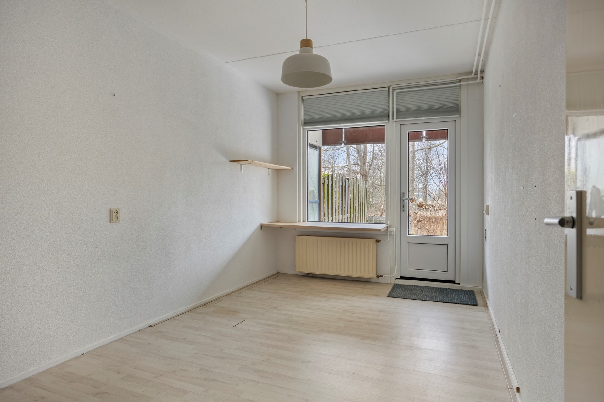 De slaapkamer is aan de tuinzijde gelegen en heeft direct toegang tot de tuin. Daarnaast biedt deze voldoende ruimte voor een twee persoons bed en heeft riante opbergmogelijkheden mede dankzij de ruime inloopkast.